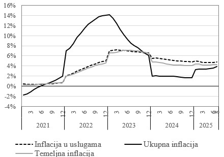 CBBiH objavljuje procjenu temeljne i inflacije u sektoru usluga za kolovoz 2025. godine 2.10.2025. Tweet Temeljem dostupnih, zvaničnih statističkih podataka za indekse potrošačkih cijena u BiH, i pripadajućih pondera, Centralna banka Bosne i Hercegovine (CBBiH) je procijenila (LINK) godišnju temeljnu inflaciju, za prvih osam mjeseci 2025. godine, na 4,31%. Godišnji rast prosječnih potrošačkih cijena u sektoru usluga je procijenjen na 4,83%. U kolovozu su inflatorni pritisci ojačali u prosječnim potrošačkim cijenama u uslužnom sektoru, i ostalim cjenovnim odjeljcima koji ulaze u izračun temeljne inflacije (Grafikon 1). CBBiH procjena temeljne inflacije na temelju zvaničnih statističkih podataka ne odstupa značajno od naše procjene iz lipanjskog kruga brzih procjena temeljne inflacije. Oslanjajući se na vrlo ograničen broj zvaničnih podataka, u lipnju smo temeljnu inflaciju za prvih osam mjeseci modelski procijenili na 24 bb ispod vrijednosti koju ovdje procjenjujemo na temelju zvaničnih statističkih podataka. Iako su odstupanja iz kratkoročnih modelskih procjena, u odnosu na procjene temeljem zvaničnih statističkih podataka, zanemariva u okolnostima niza inflatornih pritisaka iz domaćeg okruženja, a trend modelskih procjena točno projicira budući trend procjena temeljem zvaničnih podataka, konstantno niže procjene mogu ukazivati i na blagu modelsku potcijenjenost efekta rasta nominalnih plaća na temeljnu i inflaciju u sektoru usluga. Grafikon 1: Inflacija u BiH, razdoblje na razdoblje Izvor: BHAS, CBBiH.