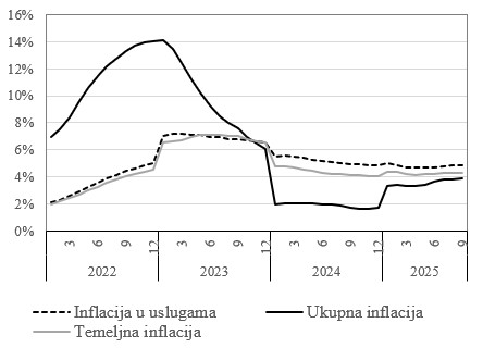 CBBiH objavljuje procjenu temeljne i inflacije u sektoru usluga za septembar 2025. godine 29.10.2025 Tweet Temeljem dostupnih, zvaničnih statističkih podataka za indekse potrošačkih cijena u BiH, i pripadajućih pondera, Centralna banka Bosne i Hercegovine (CBBiH) je procijenila (LINK) godišnju temeljnu inflaciju, za prvih devet mjeseci 2025. godine, na 4,33%. Godišnji rast prosječnih potrošačkih cijena u sektoru usluga je procijenjen na 4,84%. Prema zvaničnim statističkim podacima, u septembru su, u odnosu na avgust, inflatorni pritisci neznatno ojačali u cjenovnim odjeljcima koji ulaze u izračun temeljne inflacije. Najznačajniji utjecaj u septembru su, zbog veličine pondera, imale telefonske i telefaks usluge. Međutim, sam rast cijene ovih usluga je bio toliko nizak, da se nije odrazio na rast temeljne inflacije za prvih devet mjeseci (Grafikon 1). Na ustrajnost temeljne inflacije, u prvih devet mjeseci, najsnažniji utjecaj su imale cijene usluga u zdravstvu, te hotelima i restoranima. U cjenovnom odjeljku lična njega, u koji ulaze i usluge frizerskih salona i salona za osobnu njegu, takođe je zabilježen rast cijena, ali je snažniji bio utjecaj visokog pondera cjenovnog odjeljka na temeljnu inflaciju. Stvarne najamnine za stanovanje bilježe značajan rast tokom 2025. godine, ali je cjenovni ponder ove vrste usluga relativno nizak. Prema zvaničnim statističkim podacima, CBBiH procjena temeljne inflacije na osnovu zvaničnih statističkih podataka odstupa tek 3 bp od naše procjene temeljne inflacije iz septembarskog kruga brzih procjena. Grafikon 1: Inflacija u BiH, period na period Izvor: BHAS, CBBiH.
