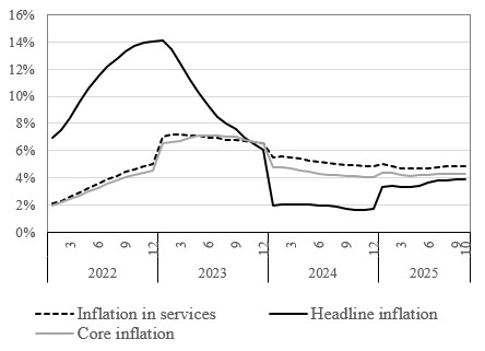 CBBH publishes its estimates on core inflation and the services sector inflation for October 2025 12/3/2025 Tweet Based on the available, official statistics for consumer price indices in BH, and the corresponding weights, the Central Bank of Bosnia and Herzegovina (CBBH) has estimated (LINK) the annual core inflation at 4.32% for the first ten months of 2025. The annual growth of average consumer prices in the service sector is estimated at 4.83%. The CBBH estimate of core inflation, based on official statistical data, is only 6 bp below our estimate of core inflation from the September nowcast round. According to official statistical data, in October, compared to September, inflationary pressures slightly strengthened in the price sections that enter into the calculation of core inflation. As a result, the levels of annual core inflation and the service sector inflation, for the first ten months, are not significantly different from the levels for the first nine months (Graph 1). Graph 1: Inflation in BH, period to period Source: BHAS, CBBH