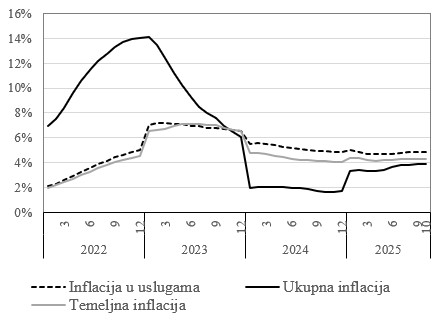 CBBiH objavljuje procjenu temeljne i inflacije u sektoru usluga za oktobar 2025. godine 3.12.2025 Tweet Temeljem dostupnih, zvaničnih statističkih podataka za indekse potrošačkih cijena u BiH, i pripadajućih pondera, Centralna banka Bosne i Hercegovine (CBBiH) je procijenila (LINK) godišnju temeljnu inflaciju, za prvih deset mjeseci 2025. godine, na 4,32%. Godišnji rast prosječnih potrošačkih cijena u sektoru usluga je procijenjen na 4,83%. CBBiH procjena temeljne inflacije na osnovu zvaničnih statističkih podataka tek je 6 bp ispod naše procjene temeljne inflacije iz septembarskog kruga brzih procjena. Prema zvaničnim statističkim podacima, u oktobru su, u odnosu na septembar, inflatorni pritisci neznatno ojačali u cjenovnim odjeljcima koji ulaze u izračun temeljne inflacije. Posljedično, ni nivoi godišnje temeljne i inflacije u sektoru usluga, za prvih deset mjeseci, nisu značajno drugačiji od nivoa za prvih devet mjeseci (Grafikon 1). Grafikon 1: Inflacija u BiH, period na period Izvor: BHAS, CBBiH.