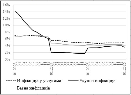 ЦББиХ објављује процјену базне и инфлације у сектору услуга за јануар 2026. године 10.3.2026. Tweet На основу доступних, званичних статистичких података за индексе потрошачких цијена у БиХ, и припадајућих пондера, Централна банка Босне и Херцеговине (ЦББиХ) је процијенила (ЛИНК) годишњу базну инфлацију, за јануар 2026. године, на 4,17%. Годишњи раст просјечних потрошачких цијена у сектору услуга је процијењен на 4,90%. ЦББиХ процјена базне инфлације на основу званичних статистичких података је 63 бп изнад наше процјене из децембарског круга брзих процјена, највећим дијелом услијед промјене пондера за пододјељке који улазе у израчун базне инфлације. Према званичним статистичким подацима, у јануару 2026. године су инфлаторни притисци, на годишњем нивоу, благо ослабили у цјеновним одјељцима који улазе у израчун базне инфлације. Истовремено, нивои годишње базне и инфлације у сектору услуга, за први мјесец 2026. године, не разликују се значајно у односу на нивое забиљежене за цијелу 2025. годину (Графикон 1). Графикон 1: Инфлација у БиХ, период на период Извор: БХАС, ЦББиХ