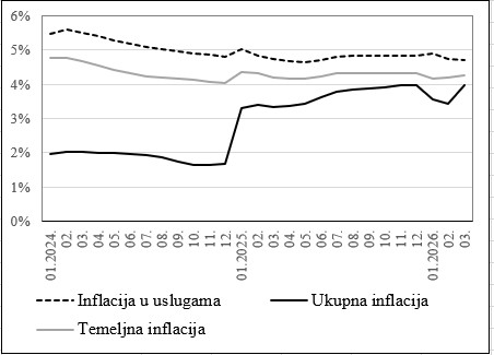 CBBiH objavljuje procjenu temeljne i inflacije u sektoru usluga za mart 2026. godine 27.4.2026 Tweet Na osnovu dostupnih, zvaničnih statističkih podataka za indekse potrošačkih cijena u BiH, i pripadajućih pondera, Centralna banka Bosne i Hercegovine (CBBiH) je procijenila (LINK) godišnju temeljnu inflaciju, za prva tri mjeseca 2026. godine, na 4,27%. Godišnji rast prosječnih potrošačkih cijena u sektoru usluga je procijenjen na 4,71%. Prema zvaničnim statističkim podacima, u martu su, u odnosu na februar, inflatorni pritisci blago ojačali u cjenovnim odjeljcima koji ulaze u izračun temeljne inflacije. CBBiH procjena temeljne inflacije na osnovu zvaničnih statističkih podataka tek je 8 bp iznad naše procjene temeljne inflacije iz martovskog kruga brzih procjena. Nivoi godišnje temeljne i inflacije u sektoru usluga, za prva tri mjeseca 2026. godine, ne razlikuju se značajno od nivoa zabilježenih za cijelu prethodnu godinu, što ukazuje na perzistentnost domaćih inflatornih pritisaka (Grafikon 1). Grafikon 1: Inflacija u BiH, period na period Izvor: BHAS, CBBiH.