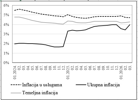 CBBiH objavljuje procjenu temeljne i inflacije u sektoru usluga za ožujak 2026. godine 27.4.2026. Tweet Na temelju dostupnih, zvaničnih statističkih podataka za indekse potrošačkih cijena u BiH, i pripadajućih pondera, Centralna banka Bosne i Hercegovine (CBBiH) je procijenila (LINK) godišnju temeljnu inflaciju, za prva tri mjeseca 2026. godine, na 4,27%. Godišnji rast prosječnih potrošačkih cijena u sektoru usluga je procijenjen na 4,71%. Prema zvaničnim statističkim podatcima, u ožujku su, u odnosu na veljaču, inflatorni pritisci blago ojačali u cjenovnim odjeljcima koji ulaze u izračun temeljne inflacije. CBBiH procjena temeljne inflacije na temelju zvaničnih statističkih podataka tek je 8 bb iznad naše procjene temeljne inflacije iz kruga brzih procjena iz ožujka. Razine godišnje temeljne i inflacije u sektoru usluga, za prva tri mjeseca 2026. godine, ne razlikuju se značajno od razina zabilježenih za cijelu prethodnu godinu, što ukazuje na perzistentnost domaćih inflatornih pritisaka (Grafikon 1). Grafikon 1: Inflacija u BiH, razdoblje na razdoblje Izvor: BHAS, CBBiH.