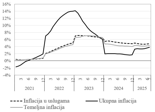 CBBiH objavljuje procjenu temeljne i inflacije u sektoru usluga za srpanj 2025. godine 27.8.2025. Tweet Temeljem dostupnih, zvaničnih statističkih podataka za indekse potrošačkih cijena u BiH, i pripadajućih pondera, Centralna banka Bosne i Hercegovine (CBBiH) je procijenila (LINK) godišnju temeljnu inflaciju, za prvih sedam mjeseci 2025. godine, na 4,32%. Godišnji rast prosječnih potrošačkih cijena u sektoru usluga je procijenjen na 4,80%. U srpnju su inflatorni pritisci ojačali u prosječnim potrošačkim cijenama u uslužnom sektoru, i ostalim cjenovnim odjeljcima koji ulaze u izračun temeljne inflacije (Grafikon 1). CBBiH procjena temeljne inflacije temeljem zvaničnih statističkih podataka ne odstupa značajno od naše procjene iz lipanjskog kruga brzih procjena temeljne inflacije. Oslanjajući se na vrlo ograničen broj zvaničnih podataka, u lipnju smo temeljnu inflaciju za prvih sedam mjeseci modelski procijenili na 23 bb ispod vrijednosti koju ovdje procjenjujemo temeljem zvaničnih statističkih podataka. Iako su odstupanja iz kratkoročnih modelskih procjena, u odnosu na procjene temeljem zvaničnih statističkih podataka, zanemariva u okolnostima niza inflatornih pritisaka iz domaćeg okruženja, a trend modelskih procjena točno projicira budući trend procjena temeljem zvaničnih podataka, konstantno niže procjene mogu ukazivati i na blagu modelsku potcijenjenost efekta rasta nominalnih plaća na temeljnu i inflaciju u sektoru usluga. Grafikon 1: Inflacija u BiH, razdoblje na razdoblje Izvor: BHAS, CBBiH.