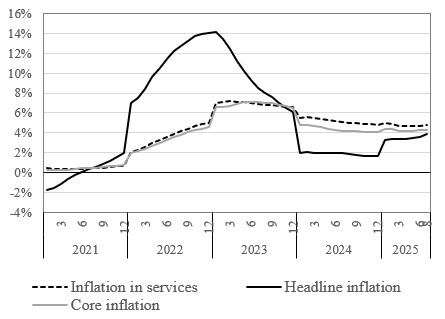 CBBH publishes estimates of core inflation and inflation in the sector of services for August 2025 10/2/2025 Tweet On the basis of the available official statistics for consumer price indices in BH, and the relevant weights, the Central Bank of Bosnia and Herzegovina (CBBH) has estimated (LINK) annual core inflation, for the first eight months of 2025, at 4.31%. The annual growth of average consumer prices in the sector of services has been estimated at 4.83%. In August, inflation pressures increased in average consumer prices in the sector of services, and other price categories included in the core inflation calculation (Graph 1). The CBBH estimate of core inflation on the basis of official statistics does not significantly differ from our estimate from the June round of core inflation nowcast. Relying on a quite limited number of official data, in June, we made a model- based estimate of core inflation for the first eight months at 24 bp below the value which we estimate at the moment on the basis of official statistics. Although deviations from short-term model-based estimates in comparison to the estimates based on official statistics are negligible in circumstances of a number of inflation pressures from the local environment, and the model estimate trend precisely projects the future trend of estimates based on official data, constantly lower estimates may indicate a slight model underestimation of the nominal wage growth effects on core inflation and inflation in the sector of services. Graph 1: Inflation in BH, period to period Source: BHAS, CBBH