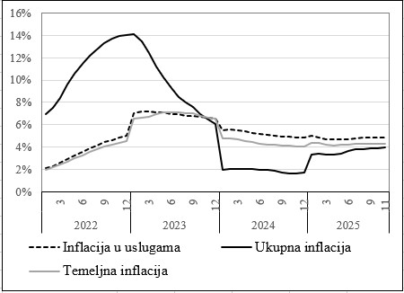 CBBiH objavljuje procjenu temeljne i inflacije u sektoru usluga za studeni 2025. godine 6.1.2026. Tweet Temeljem dostupnih, zvaničnih statističkih podataka za indekse potrošačkih cijena u BiH i pripadajućih pondera, Centralna banka Bosne i Hercegovine (CBBiH) je procijenila (LINK) godišnju temeljnu inflaciju, za prvih jedanaest mjeseci 2025. godine, na 4,32%. Godišnji rast prosječnih potrošačkih cijena u sektoru usluga je procijenjen na 4,83%. CBBiH procjena temeljne inflacije na temelju zvaničnih statističkih podataka tek je 5 bb iznad naše procjene temeljne inflacije iz prosinačkog kruga brzih procjena. Prema zvaničnim statističkim podatcima, u studenom su, u odnosu na listopad, inflatorni pritisci neznatno ojačali u cjenovnim odjeljcima koji ulaze u izračun temeljne inflacije. Posljedično, razine godišnje temeljne i inflacije u sektoru usluga, za prvih jedanaest mjeseci, gotovo su nepromijenjeni u odnosu na razinu za prvih deset mjeseci (Grafikon 1). Grafikon 1: Inflacija u BiH, razdoblje na razdoblje Izvor: BHAS, CBBiH.