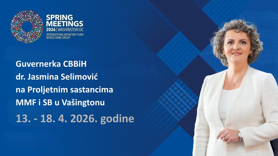 The CBBH Delegation at the Spring Meetings of the IMF and the World Bank in Washington 4/14/2026 Tweet The delegation of the Central Bank of Bosnia and Herzegovina, led by Governor Jasmina Selimović, Ph.D. is participating in the Spring Meetings of the IMF and the World Bank Group, which are held in Washington from April 13 to 18, 2026. During his stay in Washington, bilateral meetings are planned with IMF and World Bank officials, representatives of central banks and other financial institutions. A special focus is bestowed to the topics of global and regional financial stability, the consequences of the crisis in the Middle East, digital fraud in financial services, the implementation of SEPA and TIPS projects, and the challenges of economic policies in Europe. These meetings represent an important opportunity to strengthen international cooperation and improve the financial stability of Bosnia and Herzegovina.